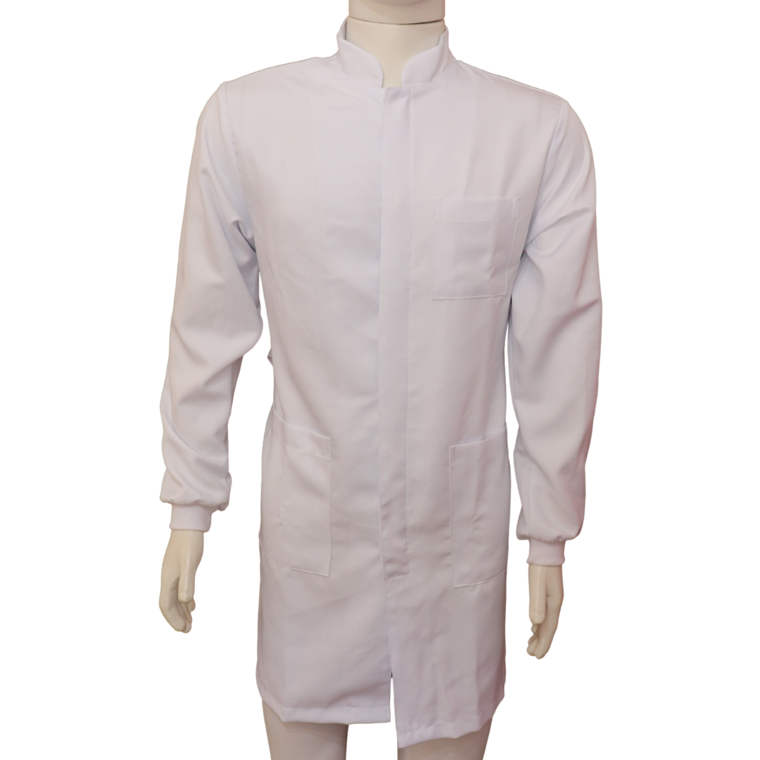 Jaleco masculino com gola padre e manga longa, garantindo elegância, conforto e liberdade de movimentos. Possui fechamento frontal com botões cobertos, punho, 2 bolsos inferiores e 1 bolso superior, oferecendo praticidade no dia a dia.