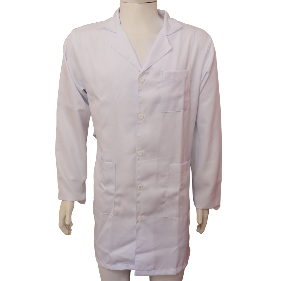 Jaleco masculino com gola tradicional e manga longa, garantindo elegância, conforto e liberdade de movimentos. Possui fechamento frontal com botões descobertos, 2 bolsos inferiores e 1 bolso superior, oferecendo praticidade no dia a dia.